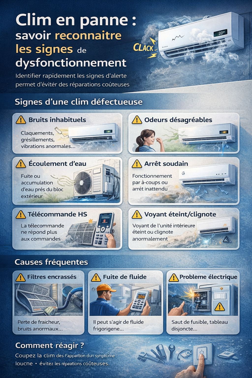 Dès qu’un signe suspect apparaît, éteignez immédiatement votre climatisation. Évitez toute manipulation hasardeuse et contactez un professionnel en décrivant précisément les anomalies observées.